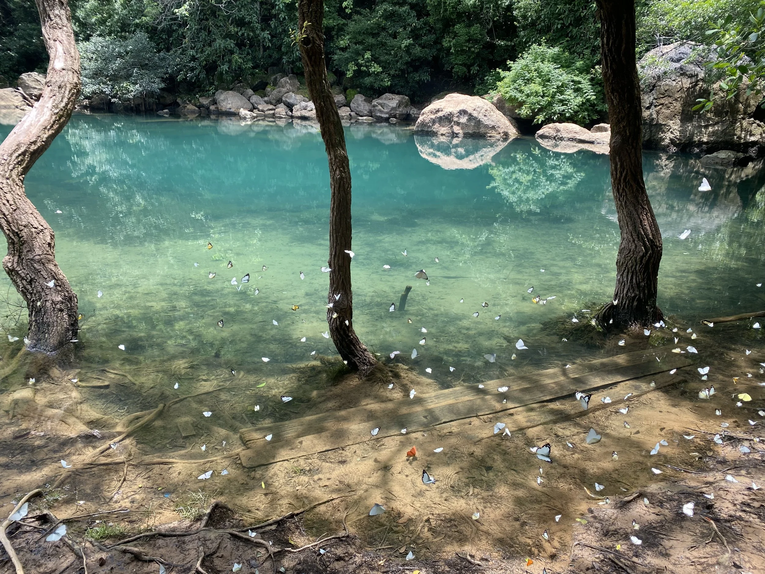 The next hour was more pretty landscapes and small villages before turning north and getting off the road with all the trucks. From here the land flattened out a bit, the sun came out, the road was good, no traffic, just easy riding. It was hot though! I stopped at a small waterfall to cool off, which is a swimming hole in dry season, but the water level and current were too high in rainy season for swimming. Hmmph.