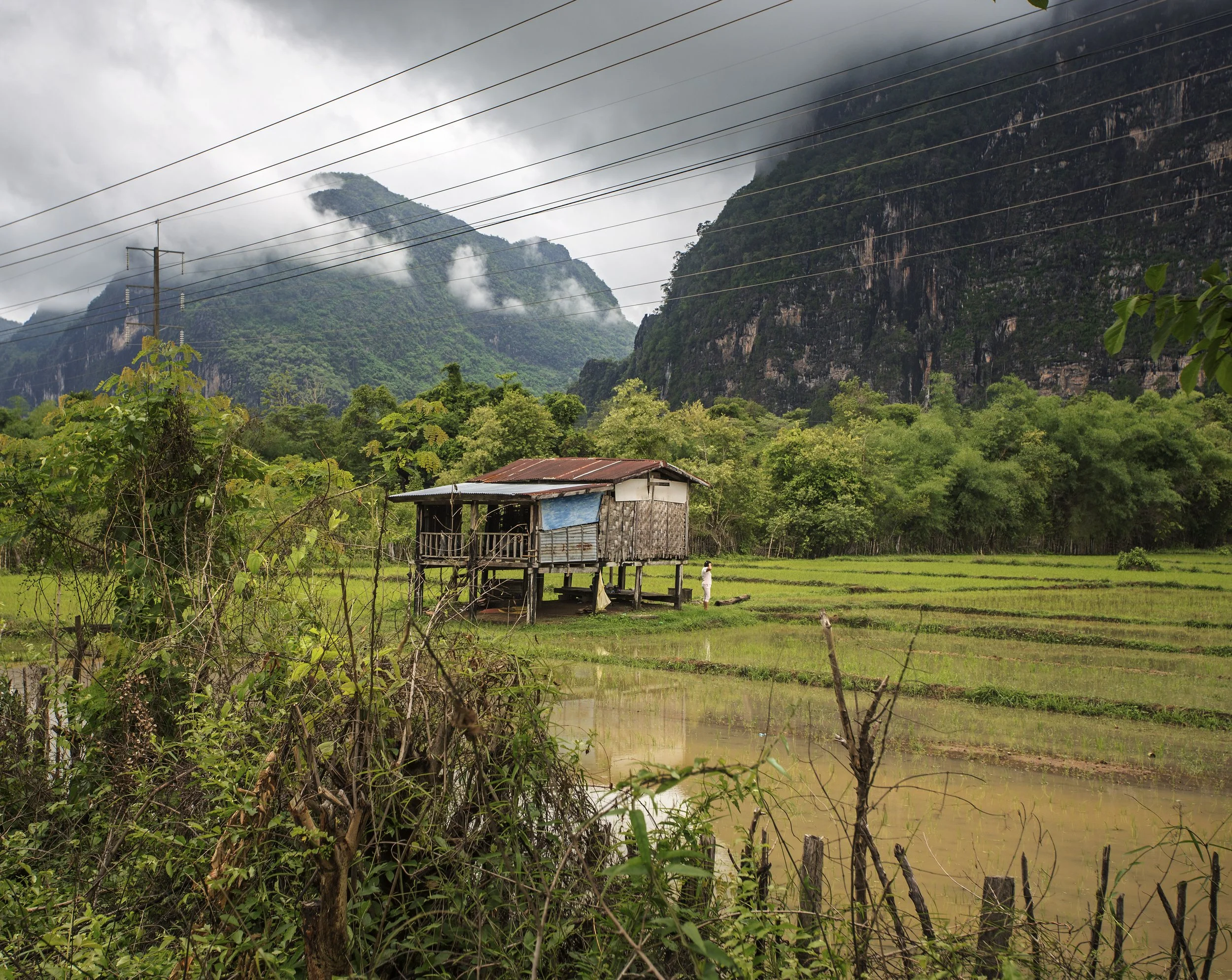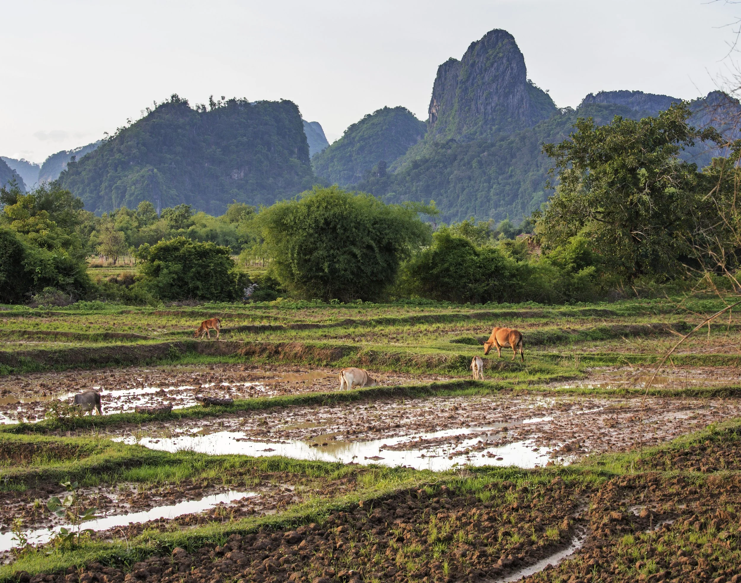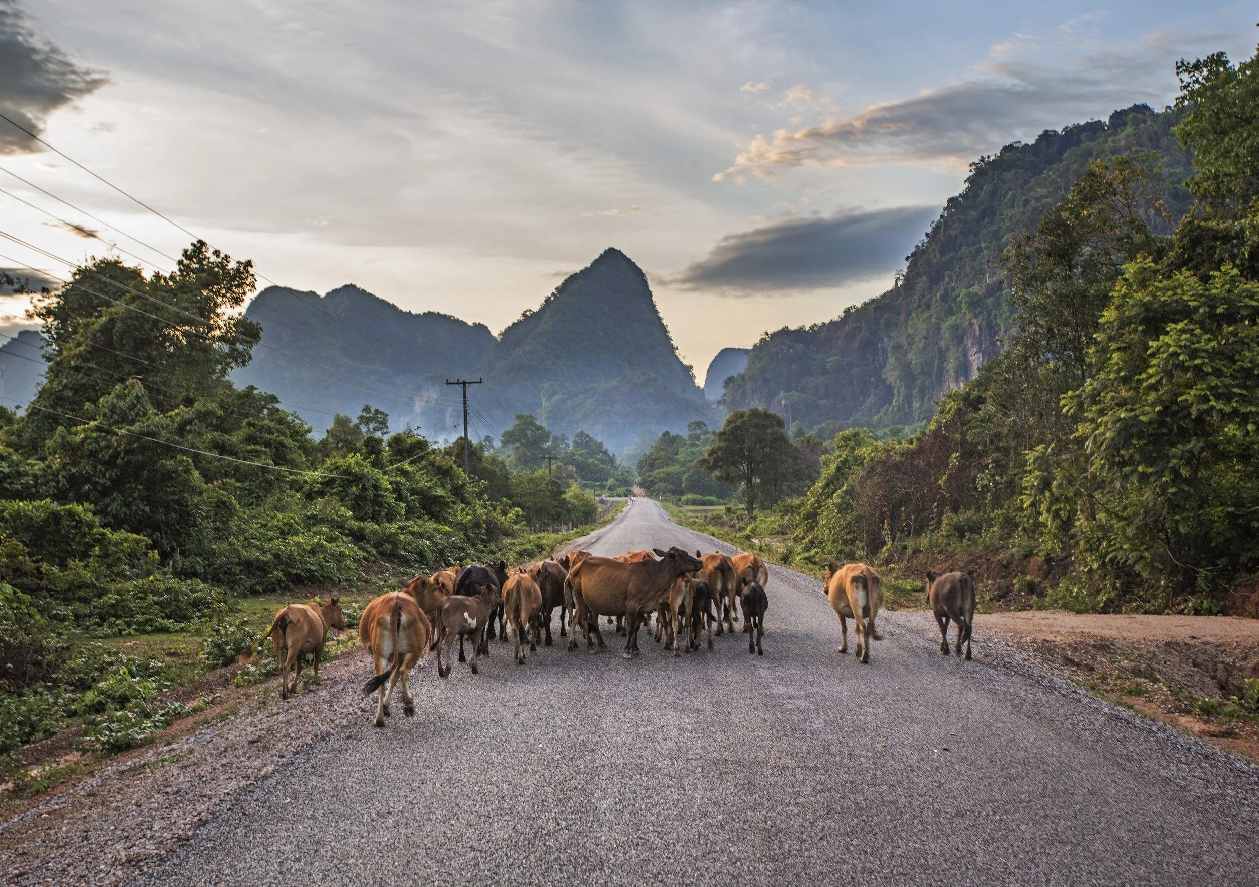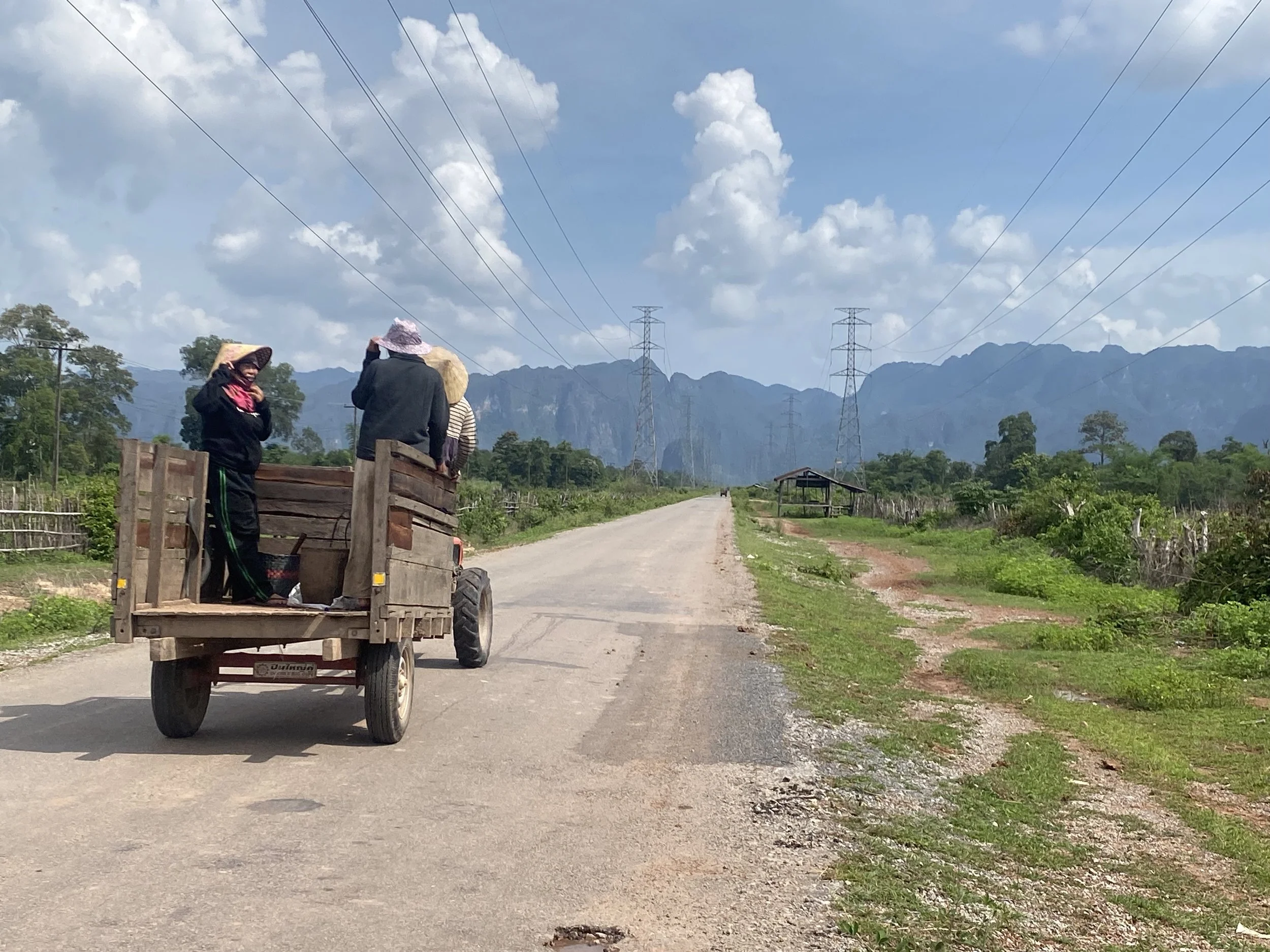 Now this is where we’re starting to get into that quintessential Laos scenery! A few minutes later you could see the karsts in the distance, those big green humps that look like they could be part of a Mario world. It’s basically guaranteed to be a lovely ride among the karsts. Although I did get kinda skunked finding a good sunset photo. Sometimes you can never find just the right spot, the right angle with the sun, a clear view, an interesting foreground, etc. Alas.