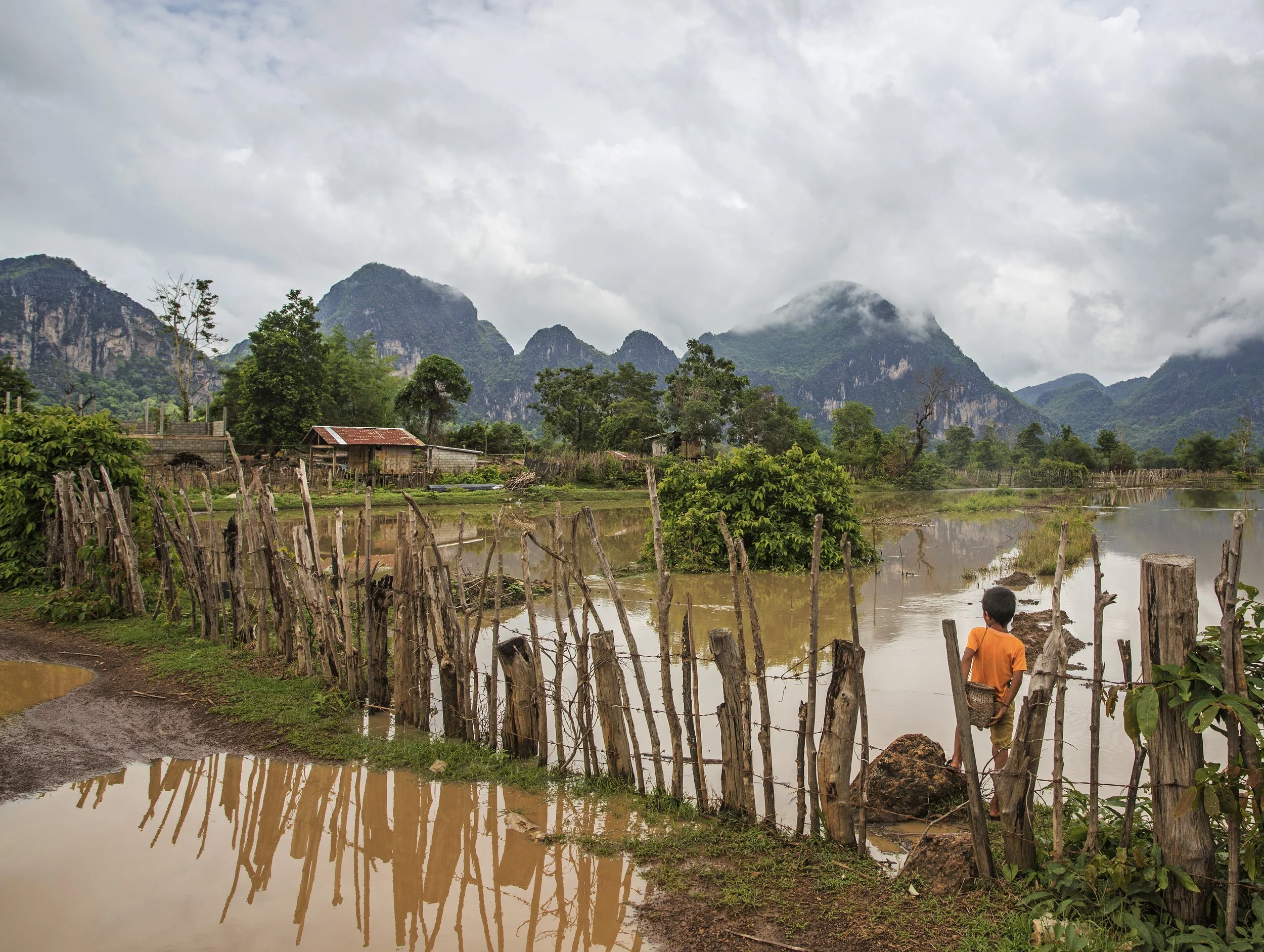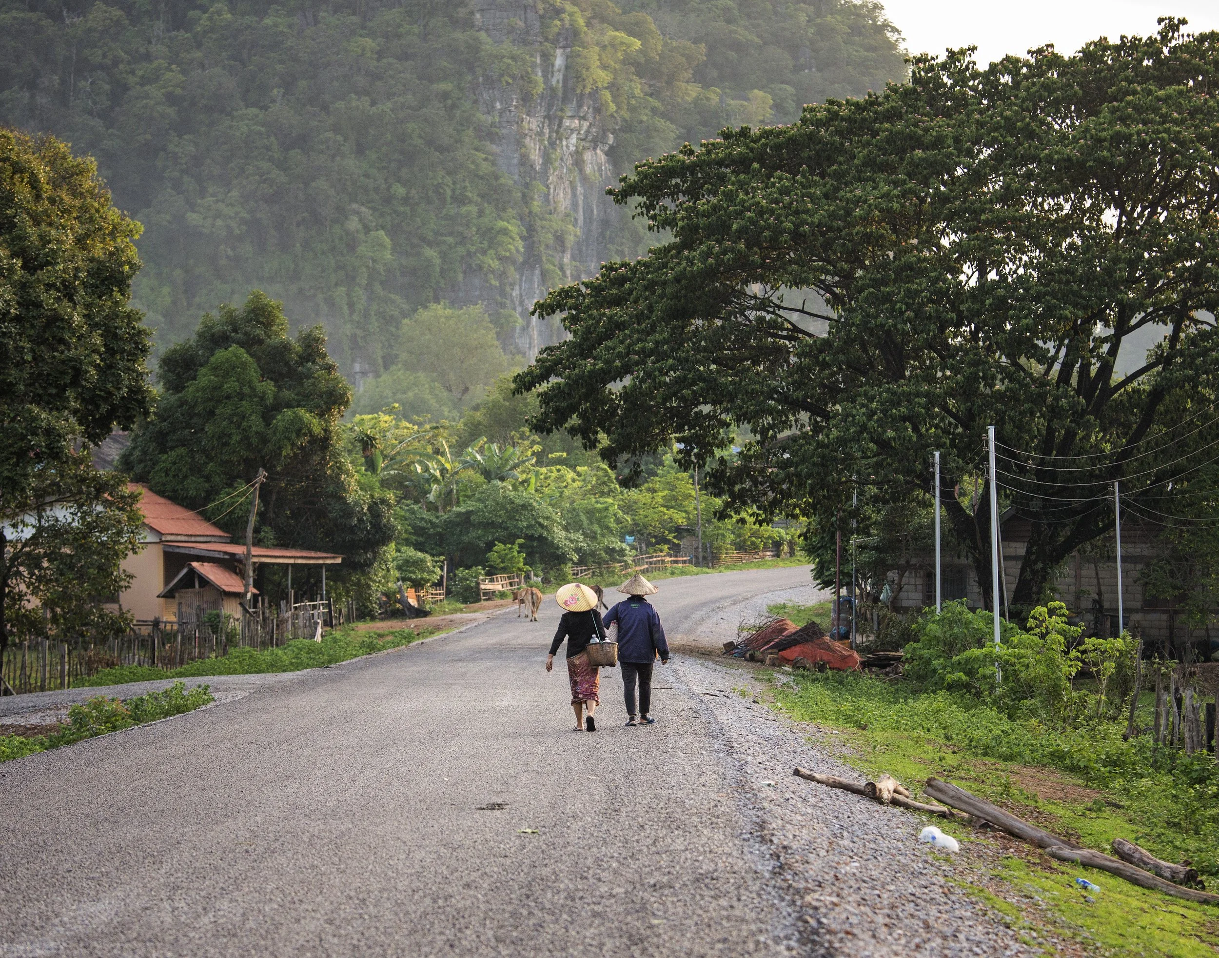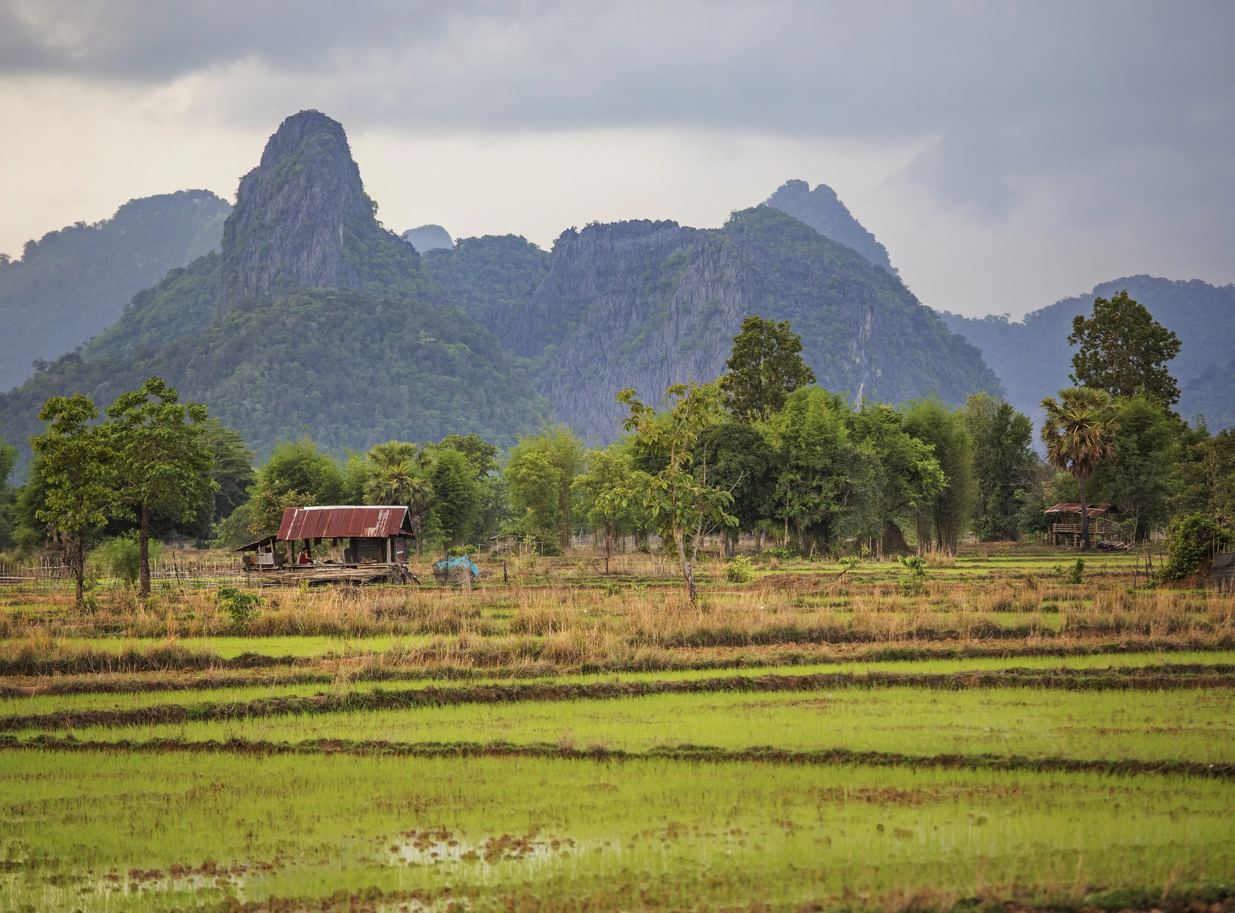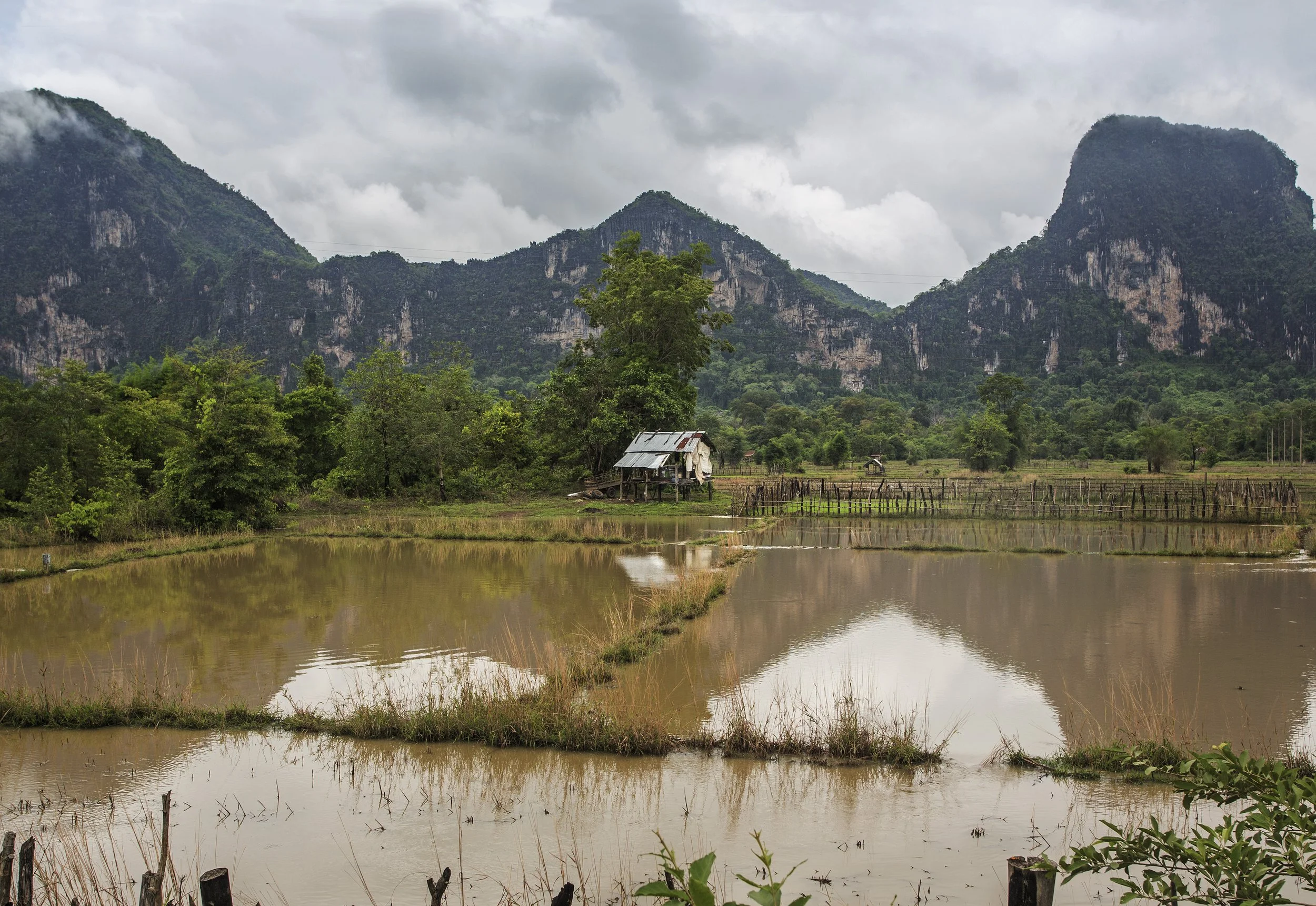 Now this is where we’re starting to get into that quintessential Laos scenery! A few minutes later you could see the karsts in the distance, those big green humps that look like they could be part of a Mario world. It’s basically guaranteed to be a lovely ride among the karsts. Although I did get kinda skunked finding a good sunset photo. Sometimes you can never find just the right spot, the right angle with the sun, a clear view, an interesting foreground, etc. Alas.