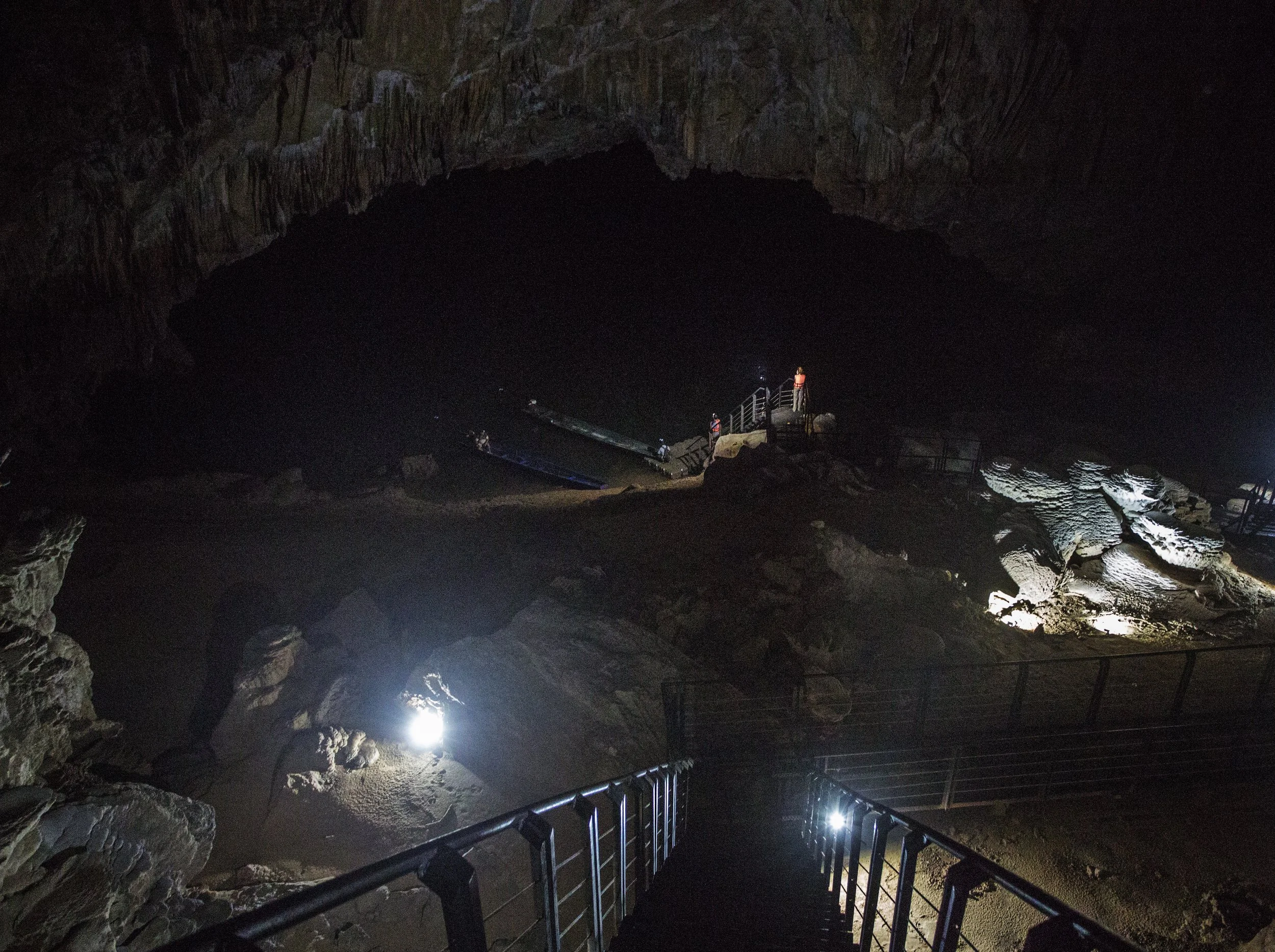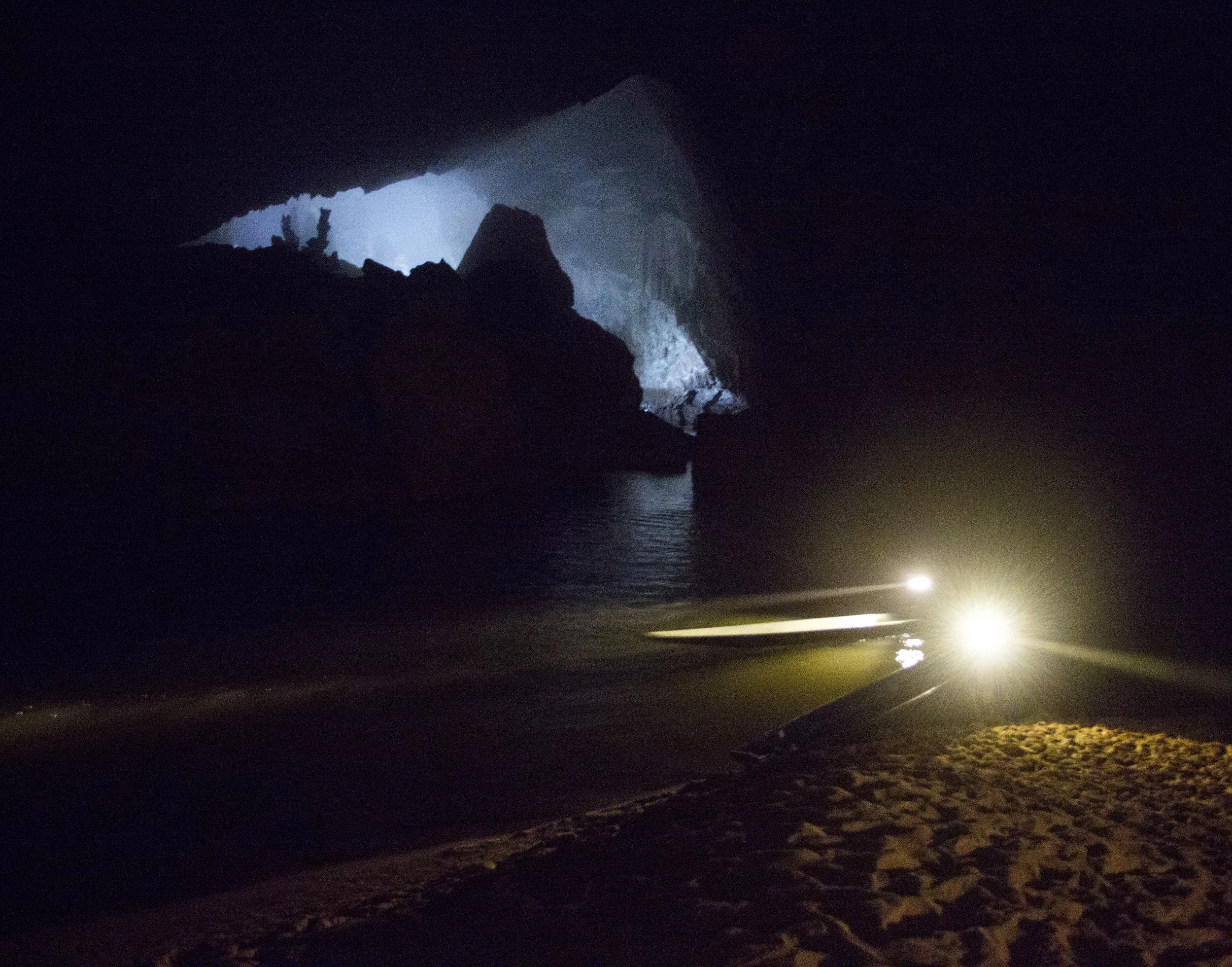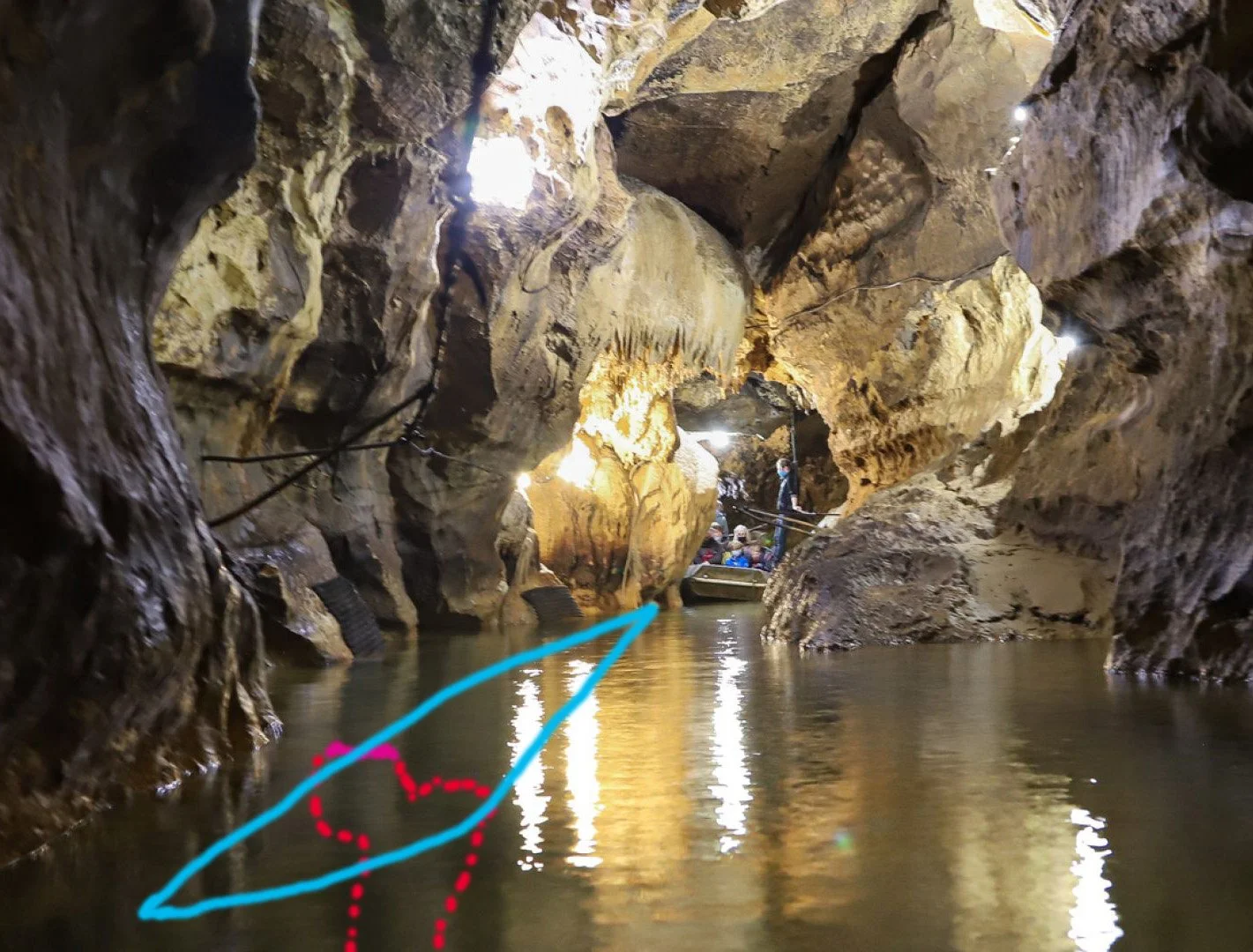 If you want to visualize it, here’s my best attempt. Our boat is stuck on a submerged two pronged rock (red dots) with one prong right below the surface and the other prong a bit deeper. This is not our cave of course, as ours doesn’t have any lights. It’s pitch black except for where we shine our headlamps.