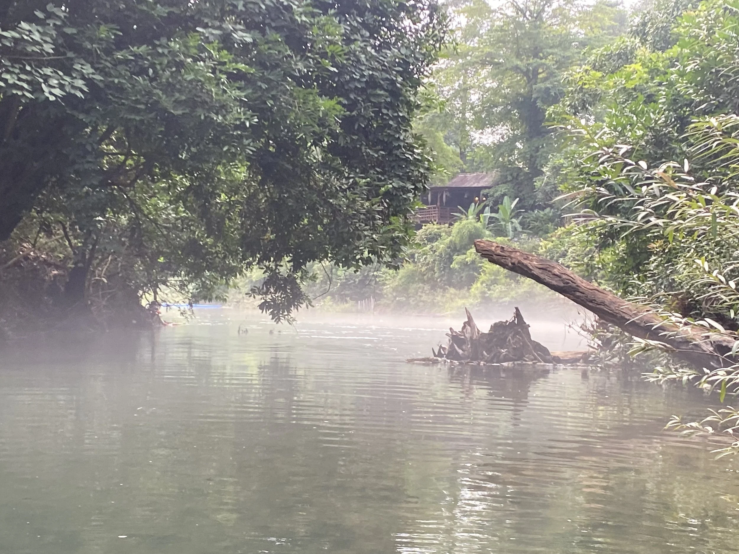 I’m trying to stand there with him, but there’s no room and it’s painful. I point that I’m going in the water, which he is emphatically shaking his head no, but there’s literally nowhere for me to go. It’s fine, I can swim. I hop in, and tread water and shine my headlamp on the boat. He relaxes a bit. He is definitely more stressed out than I am, seeing how it’s his lack of attention that got his boat stuck on a rock and his client swimming, and his job is possibly on the line. Not a great look for the guy who drives boats for a living. You’d think these guys would know this river like the back of their hand, they drive it every day. Guess not. Anyway…