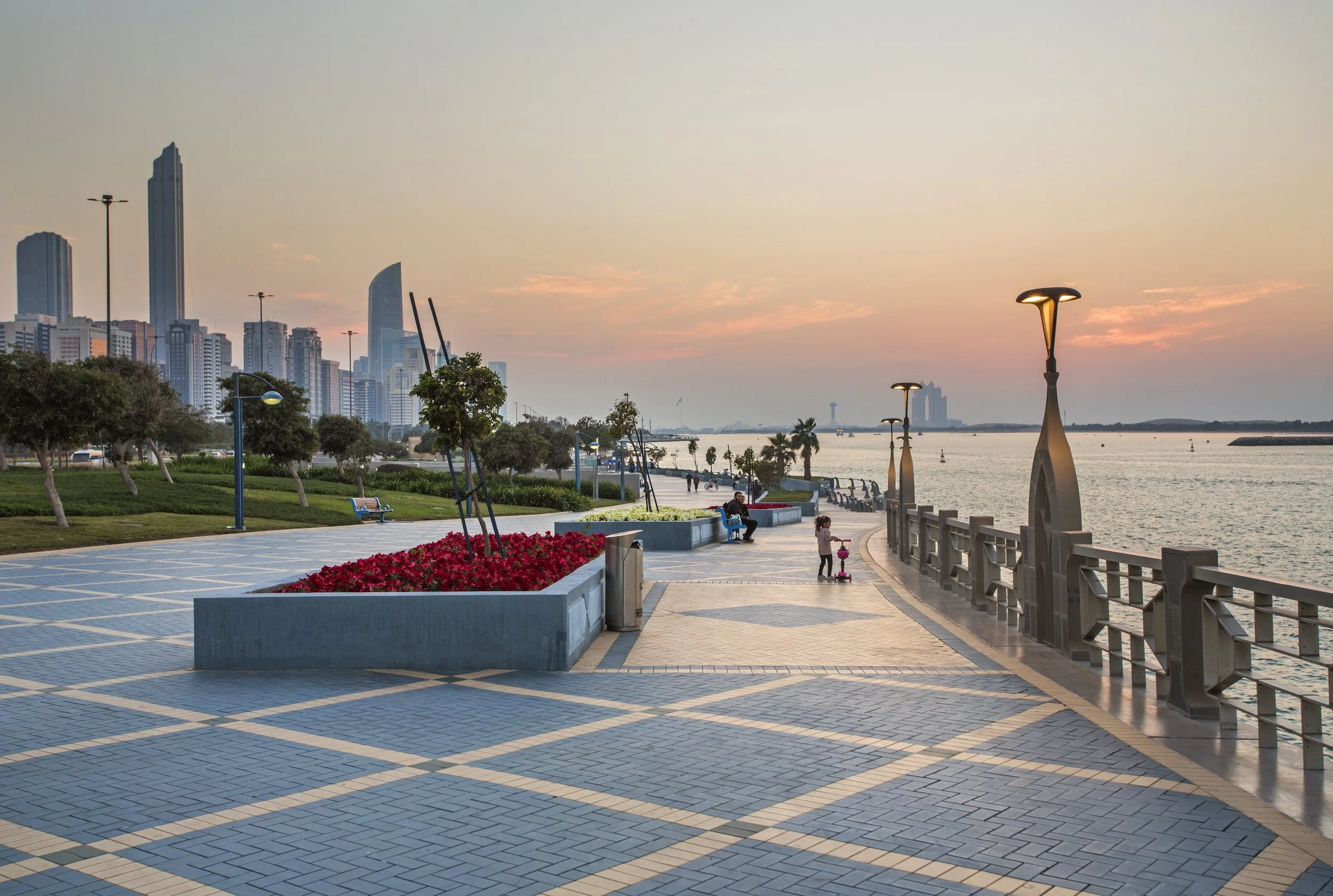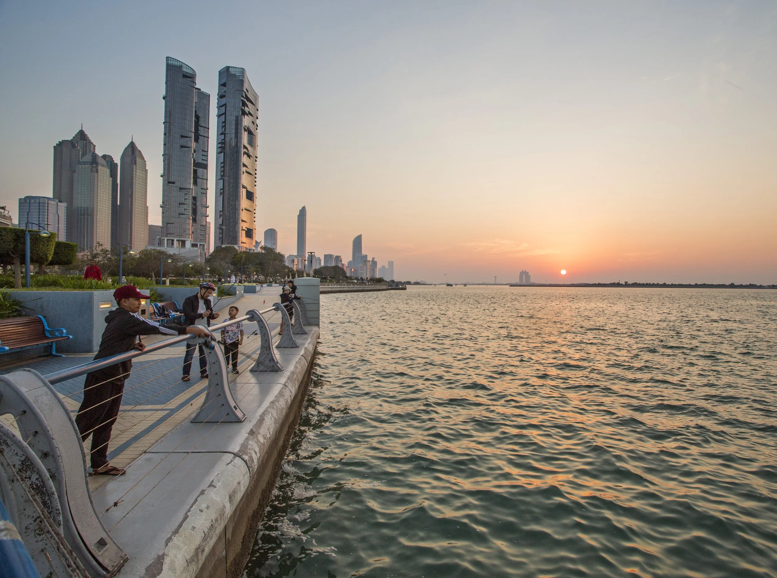 Ahhh neat architecture spaces are fun. After that it was on the bus and time to catch the sunset somewhere. I didn’t have anywhere in mind so I headed to the waterfront promenade, which runs for many kilometers.Very nicely done. Although no clouds to light up the sky, and not particularly great views of the skyline from this angle, but it was a nice relaxing stroll with lots of people out fishing or exercising. A shocking amount of people fishing, which is actually kind of annoying as you have to avoid their lines. But as usual in the gulf states, it’s still pleasant, well built, well maintained place