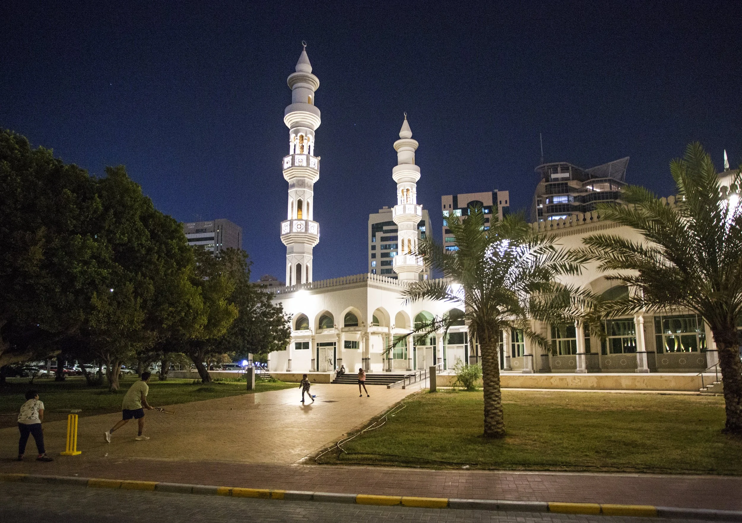 kids playing cricket in front of the very well lit mosque