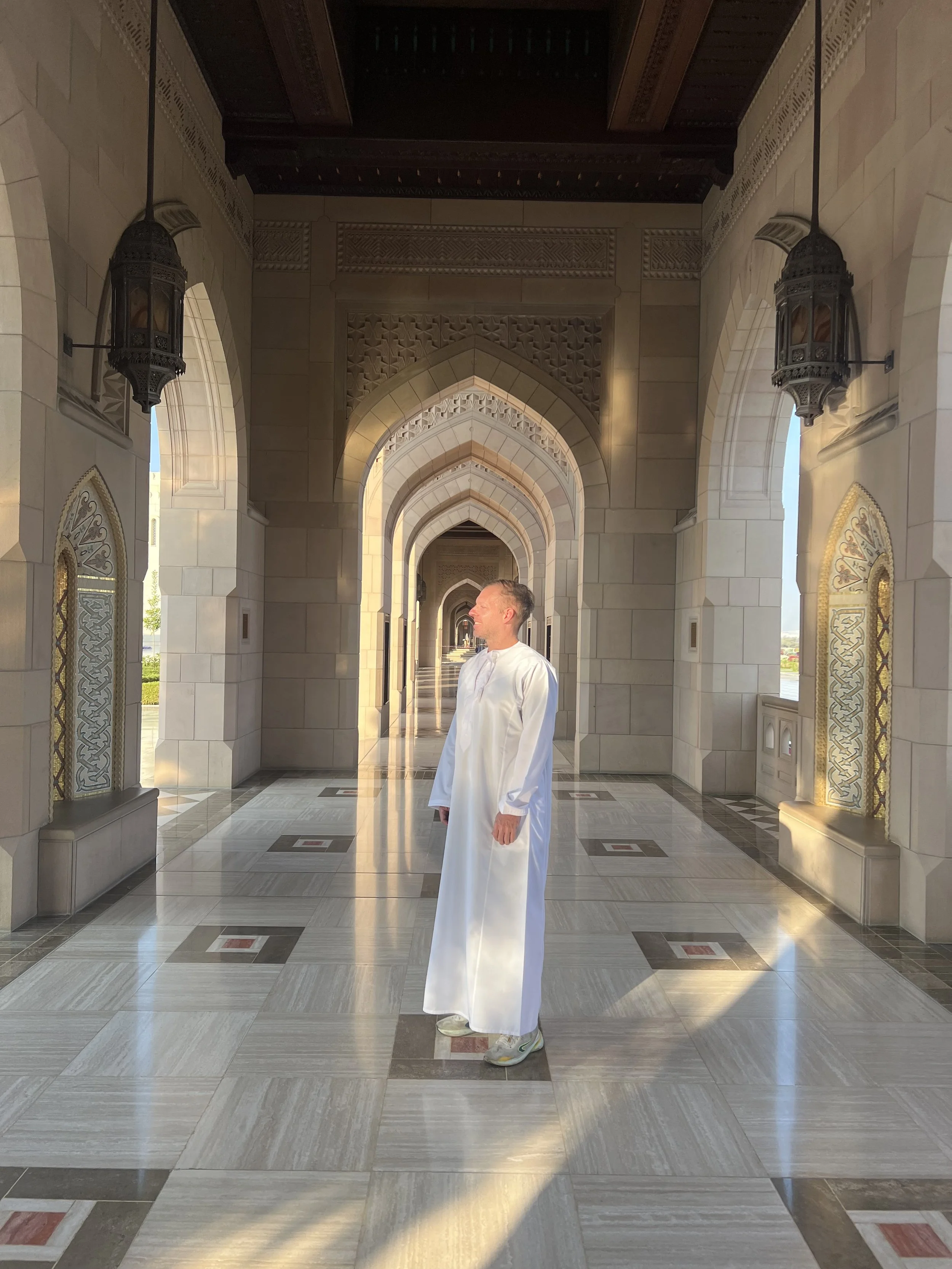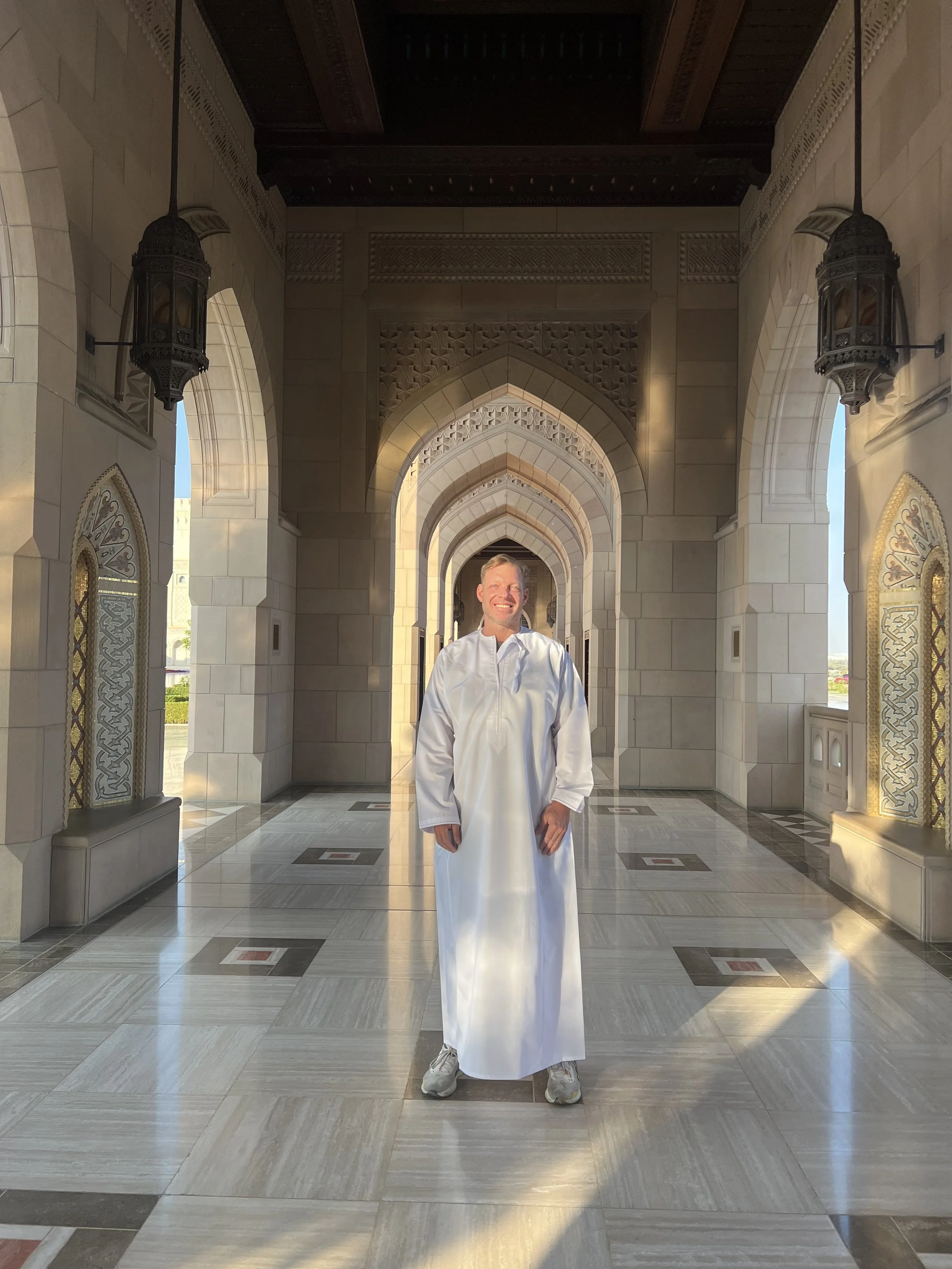 Well when I got there I found out that I could not enter the mosque unless I rented their full length traditional dress, the dishdasha. Oh man I was NOT very jazzed about this. I’ll tape a piece of fabric over my calves or something. But what choice did I have? So I very begrudgingly paid the stupid $15 or whatever to rent it, and had to try on three to get one to fit right, probably on account of my big bulging muscles. The material is just not very flexible. I did neglect to wear the traditional cap though cap, but it hindsight I probably should have just committed to the whole bit.