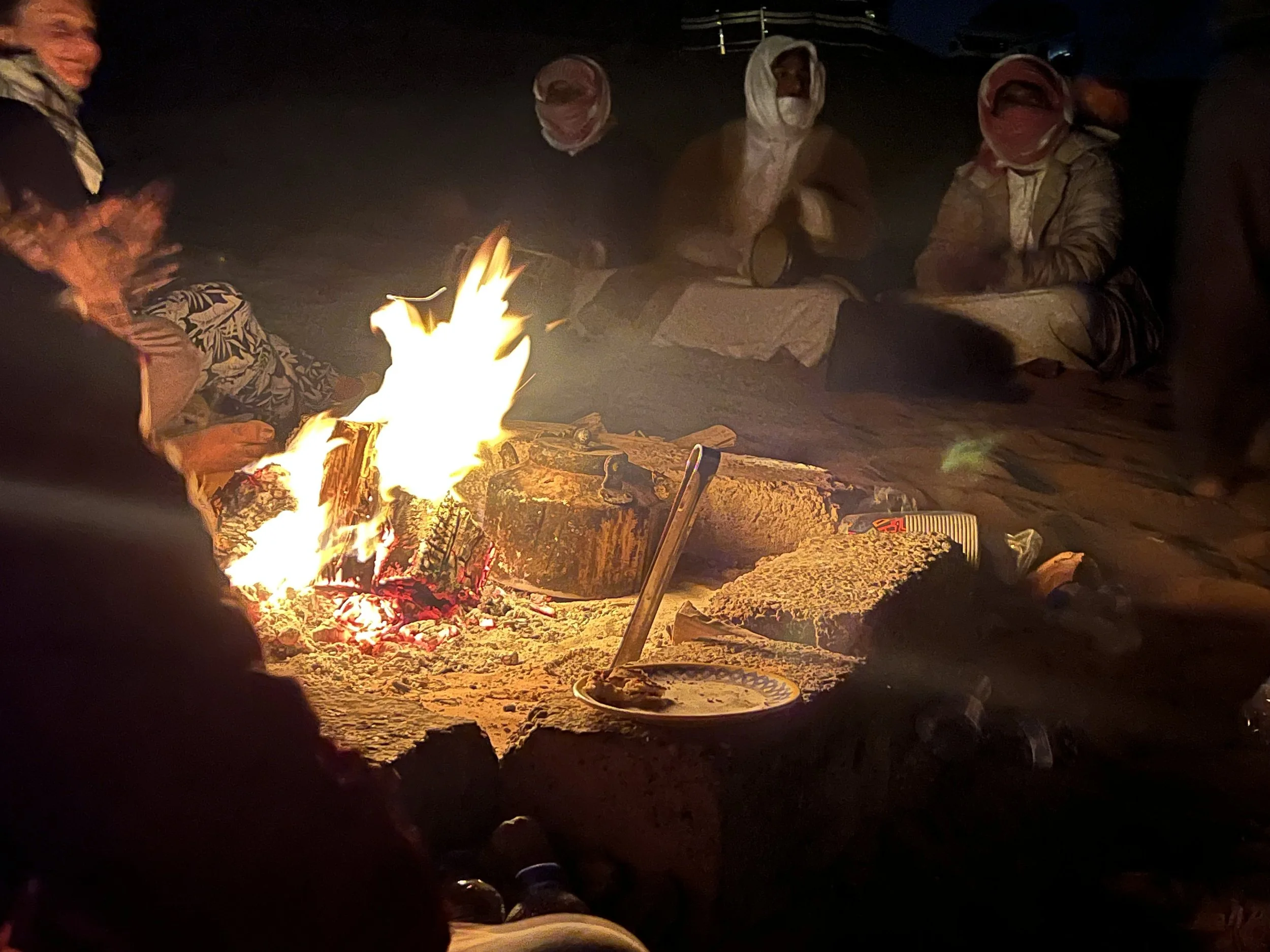 So that was fun. Dinner was at 7, and it was excellent, tons of stuff to choose from, the usual middle eastern fare with lots of grilled meats and kebabs, rice, bread, hummus, salad, pita etc. Everyone just sits on the floor together. And then after that was the bonfire where our hosts told us all about Bedouin desert life, how people survive in the desert, how it’s changed it modern times, etc. Then they sang us some Bedouin music, which started slow at first and then eventually became a bit of a dance party for a little bit. So it was a pretty fun camp. Very highly rated spot.