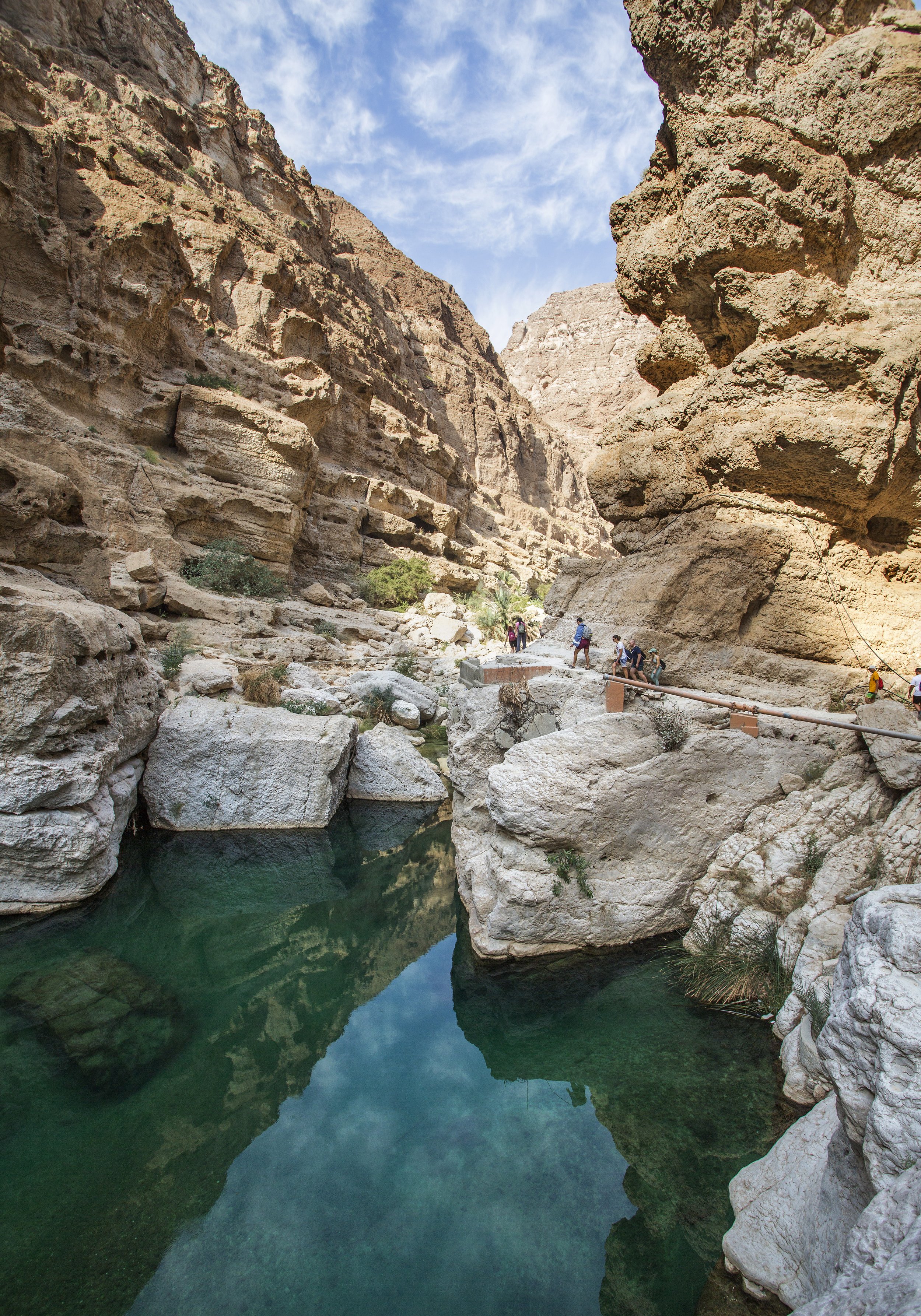 Next up was the famous Wadi Shab, probably the most famous natural attraction in all of Oman. Wadi just means canyon, but it seems to usually imply a river canyon with swimming. Although some dry up in the dry season. For this one you have to hop on a boat to cross the river, then hike 30 minutes, then you get to a spot where the canyon tightens and you basically, walk, wade, swim your way through this beautiful canyon. There’s even a little cave you can swim into. It’s a very popular spot though, so you certainly do not have it to yourselves. There’s a bunch of Indian tour groups to contend with, and they’re not small.